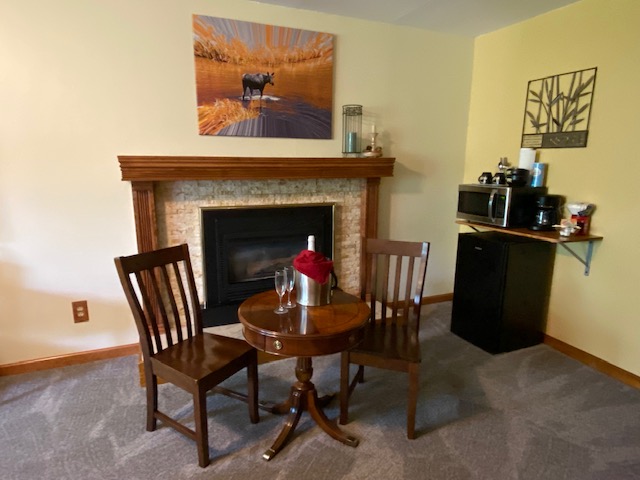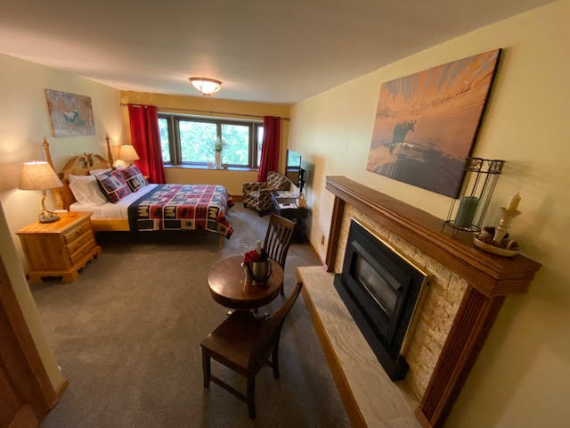 1 Bedroom • 1 Bathroom 1 Bath • Sleeps 1-2Welcome to the Majestic Moose Room, a luxurious sanctuary within the Magic Moose Bed&Breakfast that promises comfort and tranquility. As you enter, you are greeted by a cozy fireplace, with a charming table positioned in front, perfect for enjoying a warm drink or sharing intimate moments.