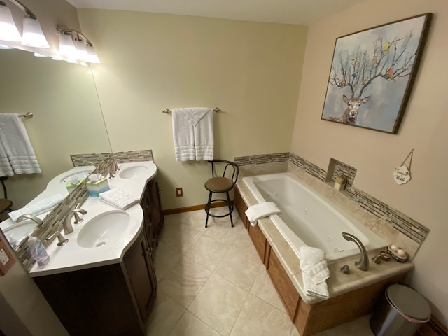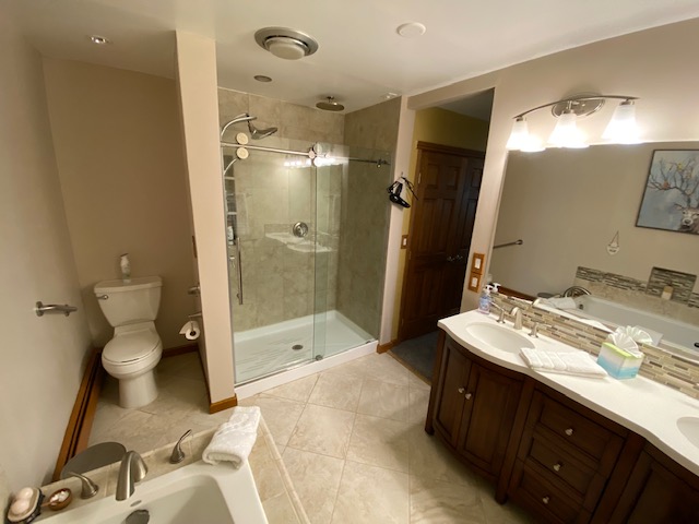 The room features a plush, inviting bed that ensures restful nights, complimented by stunning views of the surrounding landscape, allowing nature's beauty to enhance your stay. The en-suite Bathroom is a true indulgence, boasting his and her sinks and a spa shower designed for two, creating a serene space for relaxation.